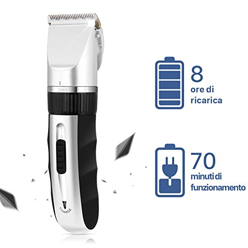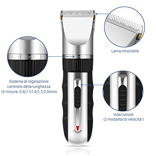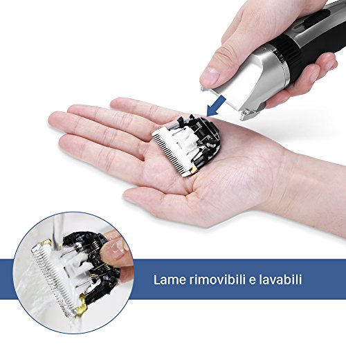 Il prodotto dimostra di avere un eccellente rapporto qualità / prezzo. Nonostante il prezzo sia molto basso, questo non pregiudica la qualità dei materiali impiegati, la facilità di utilizzo e la sicurezza all’uso. Quest’ultima caratteristica lo rende adatto anche all’uso su bambini ed anziani, che hanno la pelle decisamente più delicata. Dotato di un potente motore, si dimostra efficace sia come regolabarba che come tagliacapelli. Il prodotto, secondo gli utenti, pur presentandosi compatto e resistente è molto leggero. La leggerezza lo rende facile da usare e comodissimo. Bella la confezione, consigliabile anche per fare un gradito regalo: dispone del tagliacapelli, di quattro pettini regolatori, una spazzola per la pulizia dei punti più difficili in cui possono incepparsi i capelli, una boccetta di olio lubrificante, 4 pettini regolatori (3-6-9-12 mm). L’autonomia della batteria è variabile secondo l’utilizzo più o meno continuativo (70-120 minuti), ed il caricabatteria si dimostra poco ingombrante. Facile a pulirsi, poiché la testina si rimuove ed è lavabile sotto acqua corrente. Meglio lavarla più spesso, in quanto si riducono le contaminazioni batteriche. La lama in ceramica è resistente all’usura, ed il passo del dente è regolabile attraverso una ghiera circolare. (a 0,8 – 1,1 – 1,4 – 1,7 – 2,00 mm). Prodotto senz’altro da consigliare.
