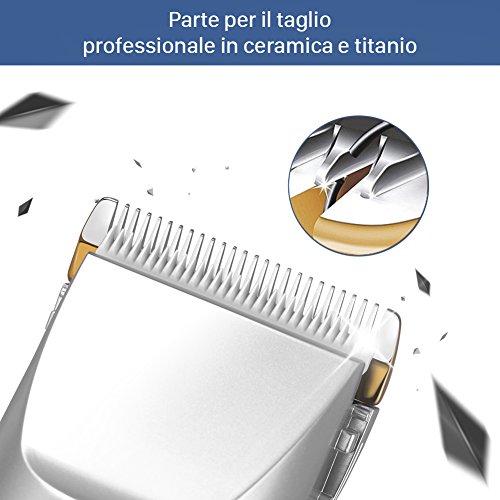Tagliacapelli e rasoio elettrico, due in uno. La lama della testina è molto affilata, con un angolo di rasatura a 45 gradi. Consente una rasatura uniforme veloce e pratica. L’attrito è ridotto, la rasatura indolore, ed è un prodotto molto resistente. Prodotto da usare in casa, sia per gli adulti che per i bambini, sostituisce il barbiere. La testina è in ceramica e titanio, facilmente rimovibile e lavabile. Il lavaggio frequente della stessa riduce le contaminazioni batteriche. Viene utilizzato sia per tagliare i capelli che per regolare la barba, dispone di 4 pettini che regolano la lunghezza di taglio. C’è la possibilità di utilizzarlo senza il pettine, e regolare il taglio minimo, che è  in questo caso è 0,8 mm. La regolazione della distanza tra i denti viene fatta su una ghiera circolare intorno al tagliacapelli, vicino alla lama.  Alcuni lo utilizzano anche come rasoio per barba, pur non tagliando a zero (la lunghezza minima di taglio è infatti di 0,8 mm).