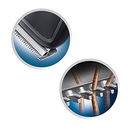 Il rasoio Remington HC5700 è un prodotto di qualità che si posiziona nella fascia media del settore. E’ dotato di una lama tagliente e affilata in titanio. Questo materiale permette infatti al dispositivo di poter essere longevo e di fornire rasature di qualità. Inoltre è resistente allo scorrere del tempo, alle botte o cadute e all’azione degli agenti esterni che possono danneggiare il rasoio oltremodo. Ha un design moderno e delle linee che permettono di sfruttarlo al meglio. Ha una forma allungata e rettangolare e sul lato della lama è leggermente incurvato per permettere una migliore presa. In questo modo infatti lo si potrà maneggiare al meglio delle possibilità ed in ogni situazioni, anche quando si andranno a svolgere operazioni di precisione. Una delle caratteristiche principali del tagliacapelli Remington HC5700 è la possibilità di poterlo utilizzare anche senza cavo. Grazie alla batteria al litio integrata, infatti, può garantire le stesse prestazioni di qualità anche fuori casa.Ciò lo qualifica anche come possibile dispositivo da viaggio grazie ai settantacinque minuti di autonomia che permettono di eseguire cinque o sei rasature senza doverlo ricaricare. E’ inoltre dotato di diversi pettini regolabili che offrono viaria scelta e precisione in fase di rasatura, ampliando ulteriormente le funzionalità.